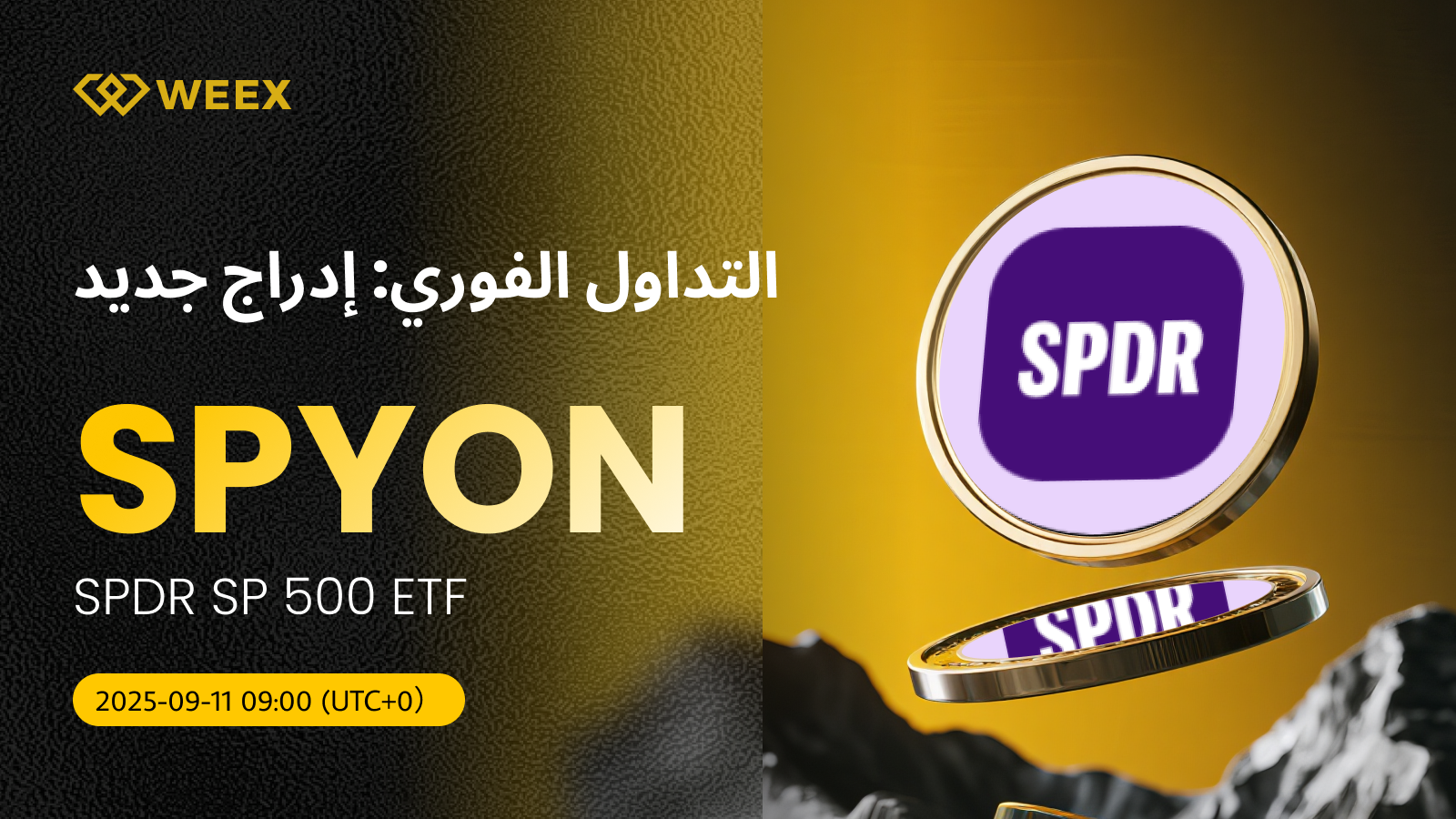 يسعدنا أن نعلن أن SPDR SP 500 ETF (SPYON) متاح الآن رسميًا في سوق التداول الفوري على WEEX! من الآن فصاعدًا، يمكنك تداول SPYON/USDT بسهولة على منصة WEEX. إليك المزيد من التفاصيل: