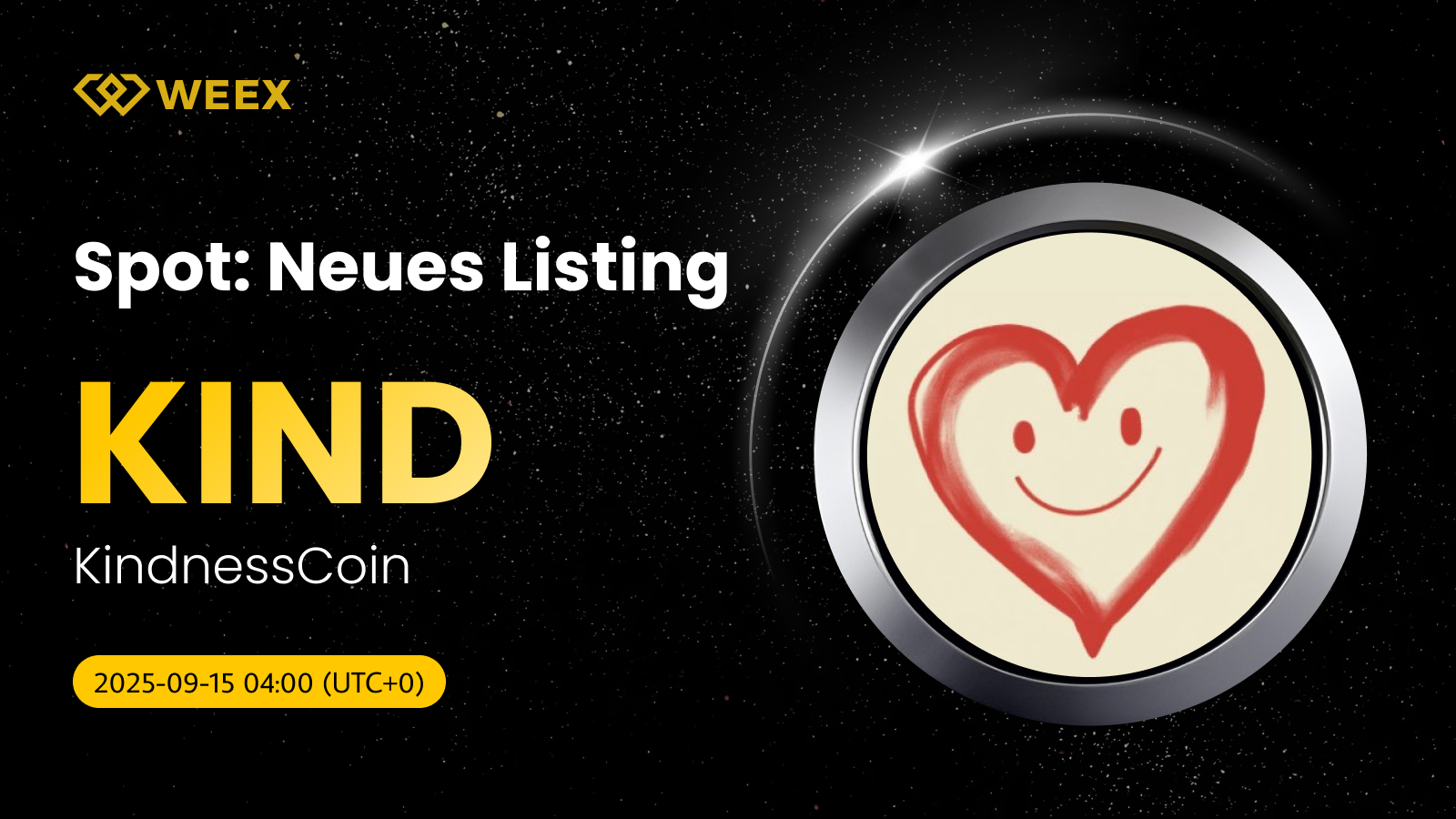 Wir freuen uns, bekannt zu geben, dass KindnessCoin (KIND) jetzt offiziell auf dem WEEX Spot-Handelsmarkt verfügbar ist! Ab sofort können Sie KIND/USDT ganz einfach auf der WEEX-Plattform handeln. Hier sind weitere Details: