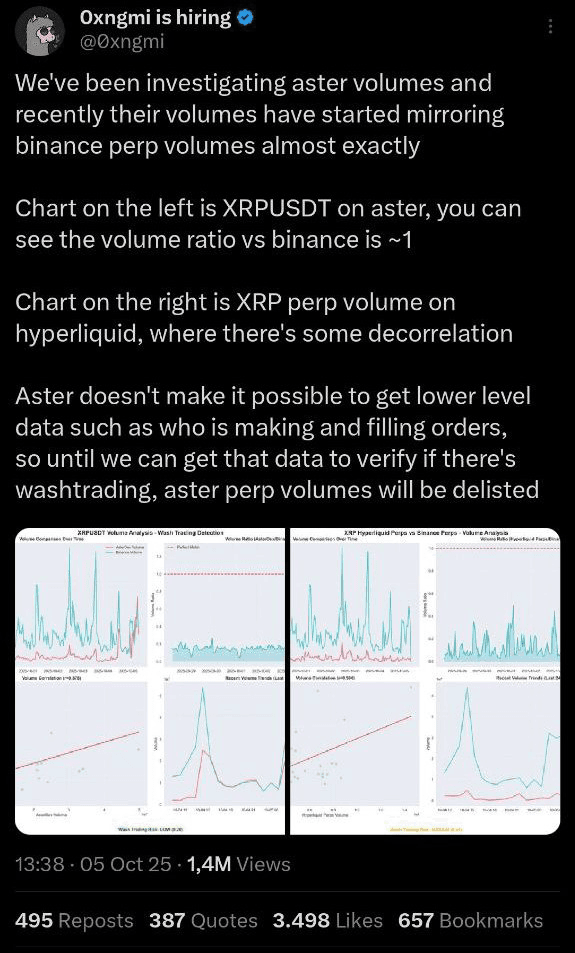 Am 5. Oktober 2025 entfernt DeFiLlama die ASTER-Handelsdaten von ihrer Plattform (Quelle: CoinTelegraph zu Delisting). Grund: Eine 1:1-Korrelation des ASTER-Volumens mit Binance-Futures, besonders bei den Paaren XRP/USDT und ETH/USDT (XRP Volumen auf ASTER vs Binance).