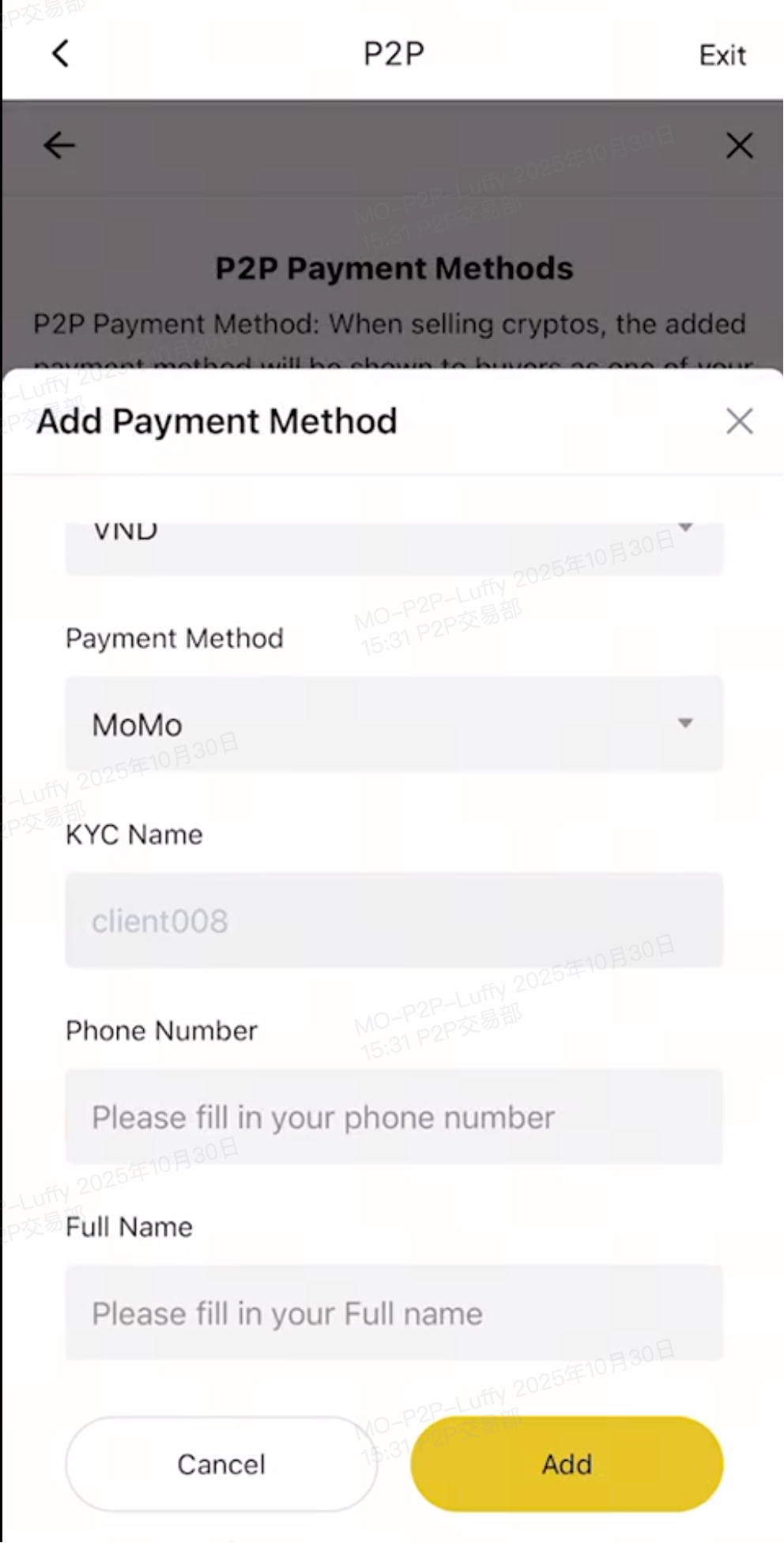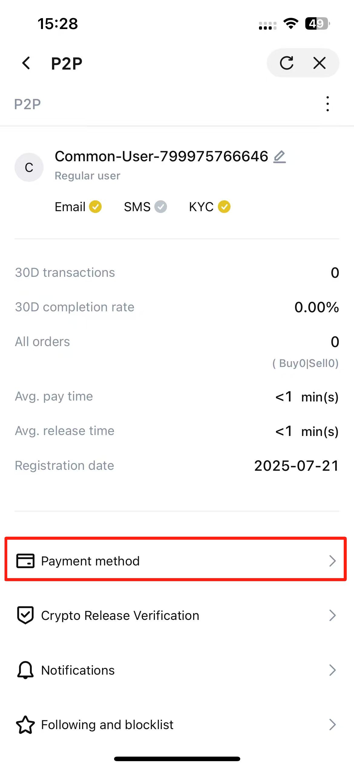 - Desplácese hacia abajo hasta "Métodos de pago P2P" y seleccione "Añadir método de pago".