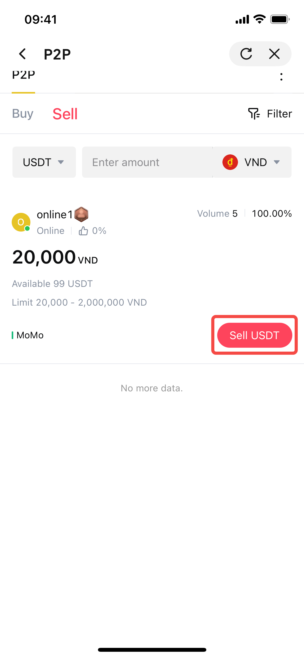 - En la página de trading P2P, selecciona la pestaña "Vender" , y elige la criptomoneda que estás vendiendo (como USDT o BTC).