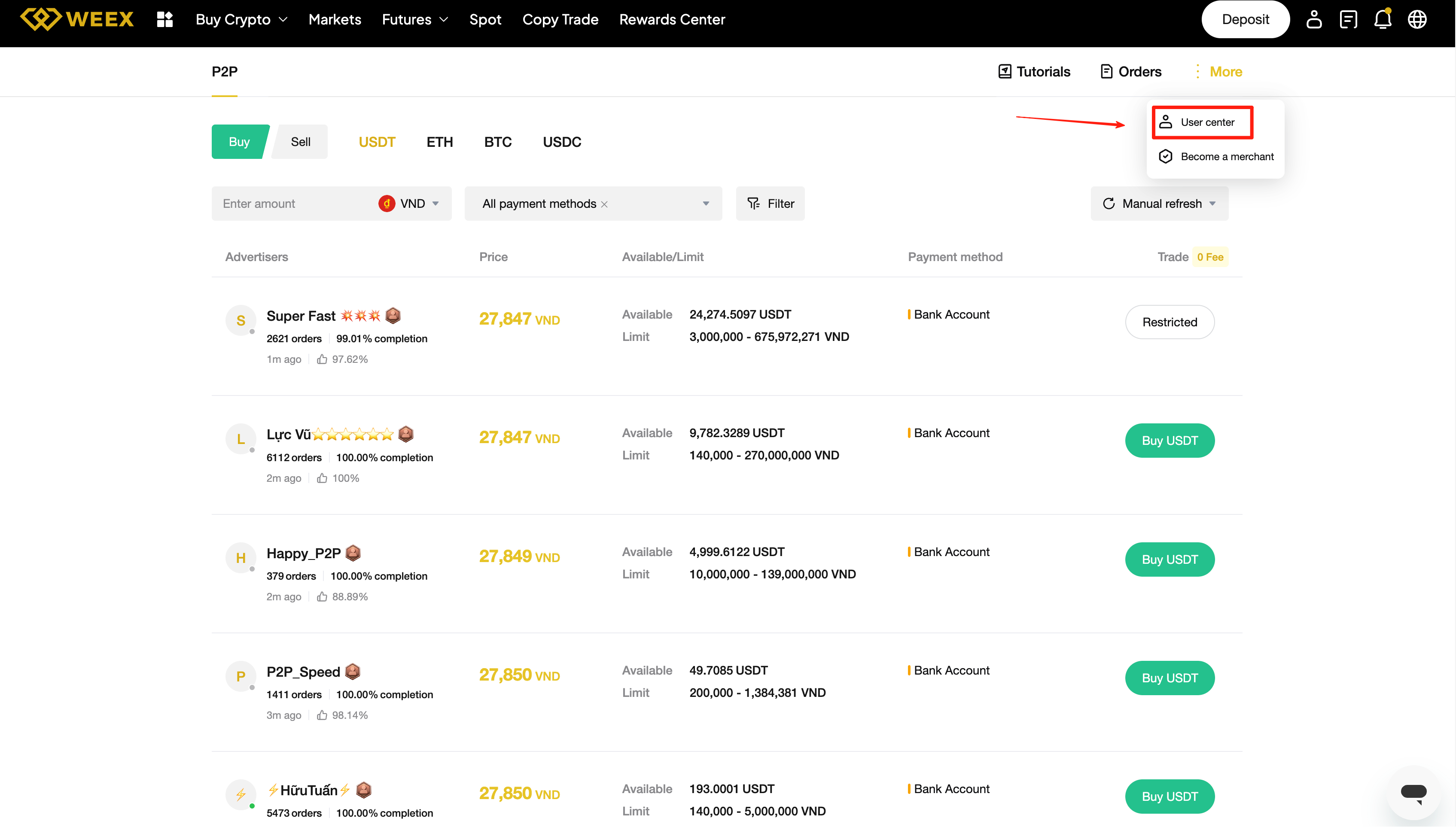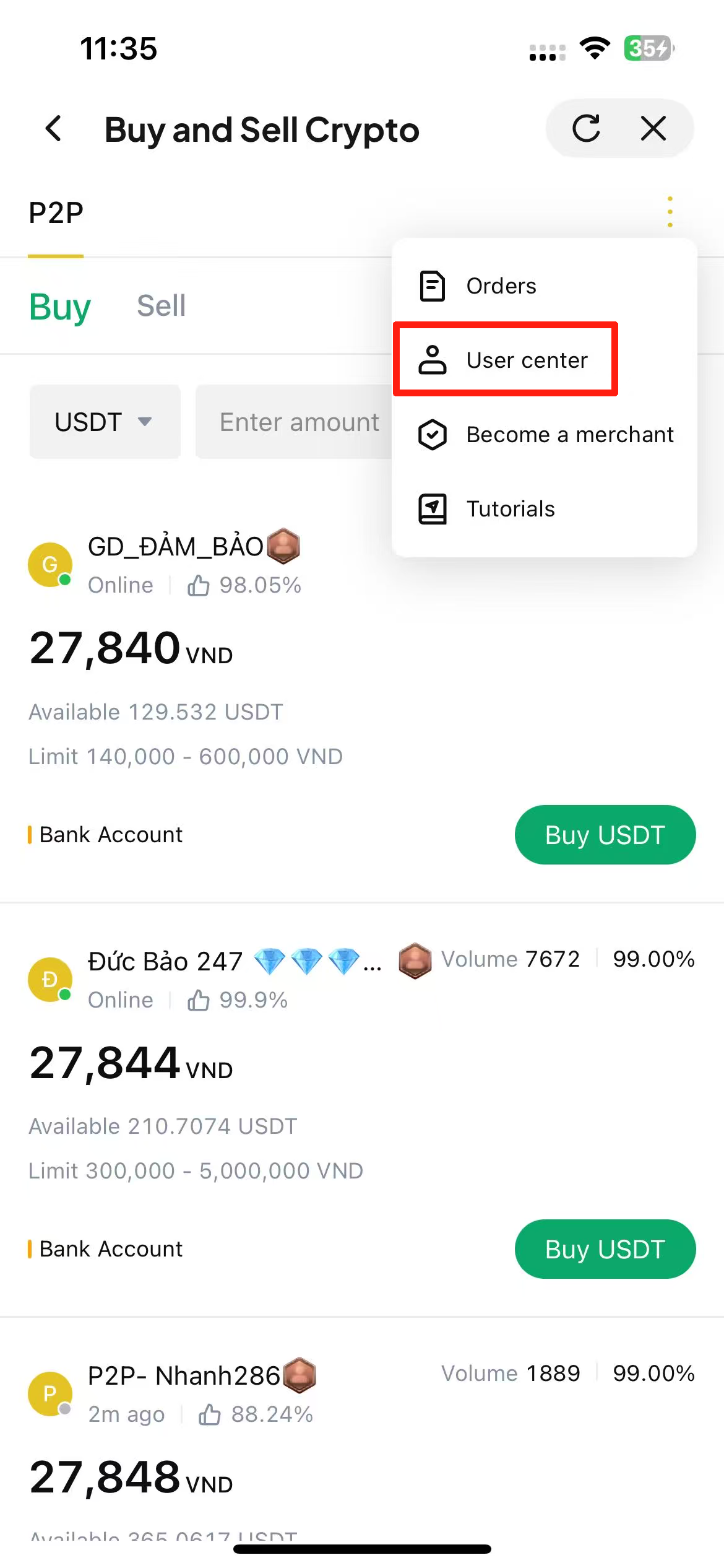 - Vaya a la página de gestión P2P: Pulsa el icono de tres puntos en la esquina superior derecha y selecciona "Centro de usuario".
