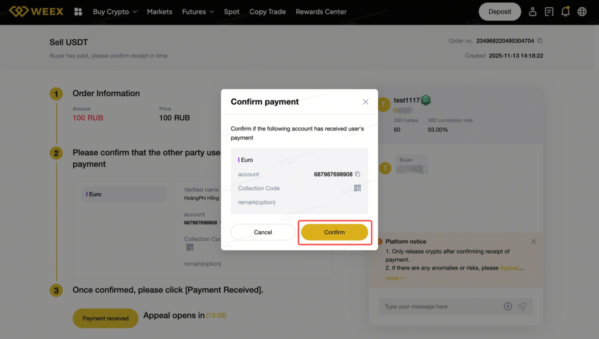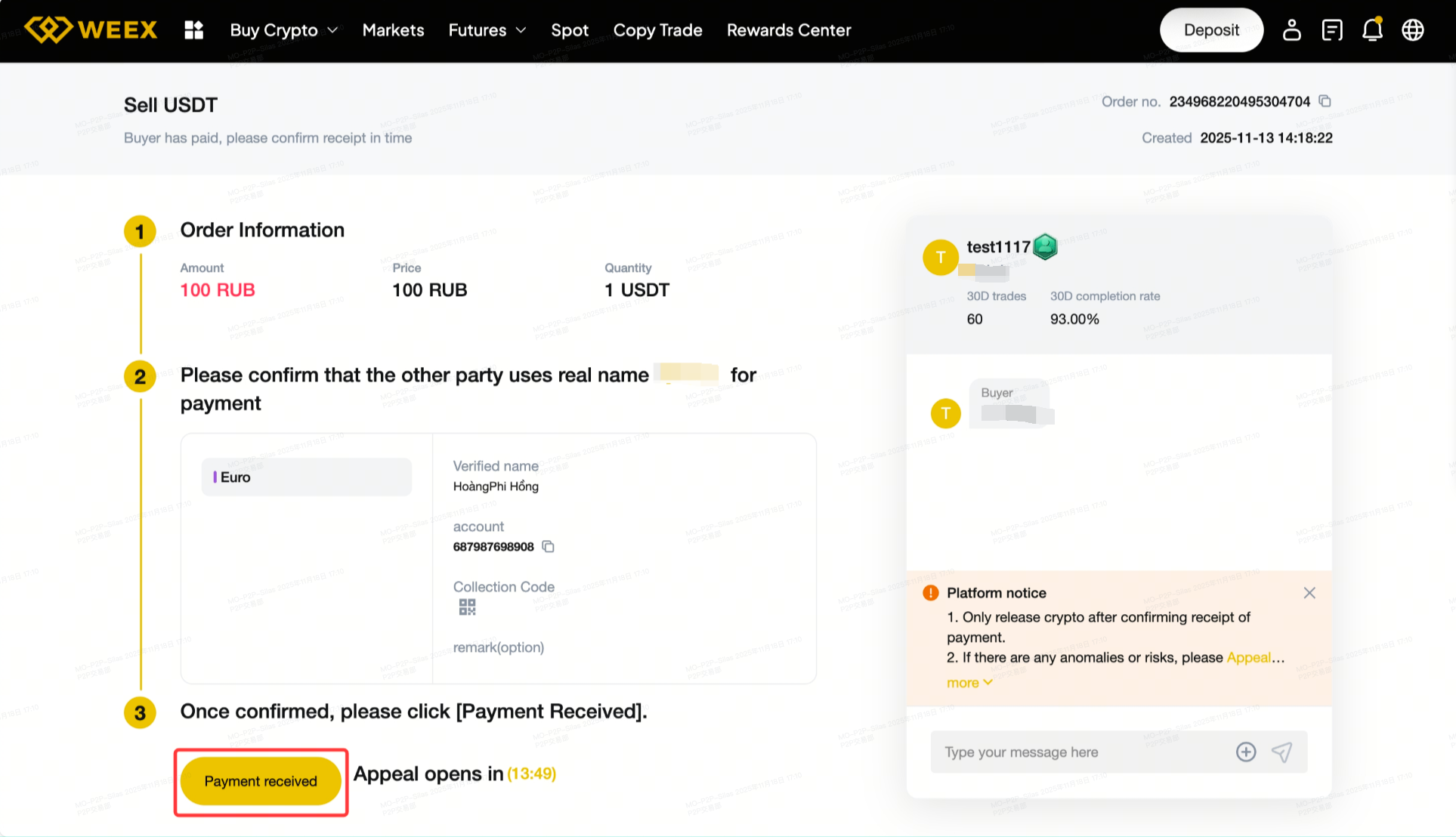 - Utilice el botón "Appeal" en los detalles del pedido para informar del problema a WEEX. Le ayudaremos a resolver el problema revisando la prueba de pago del comprador y el estado de su cuenta.
