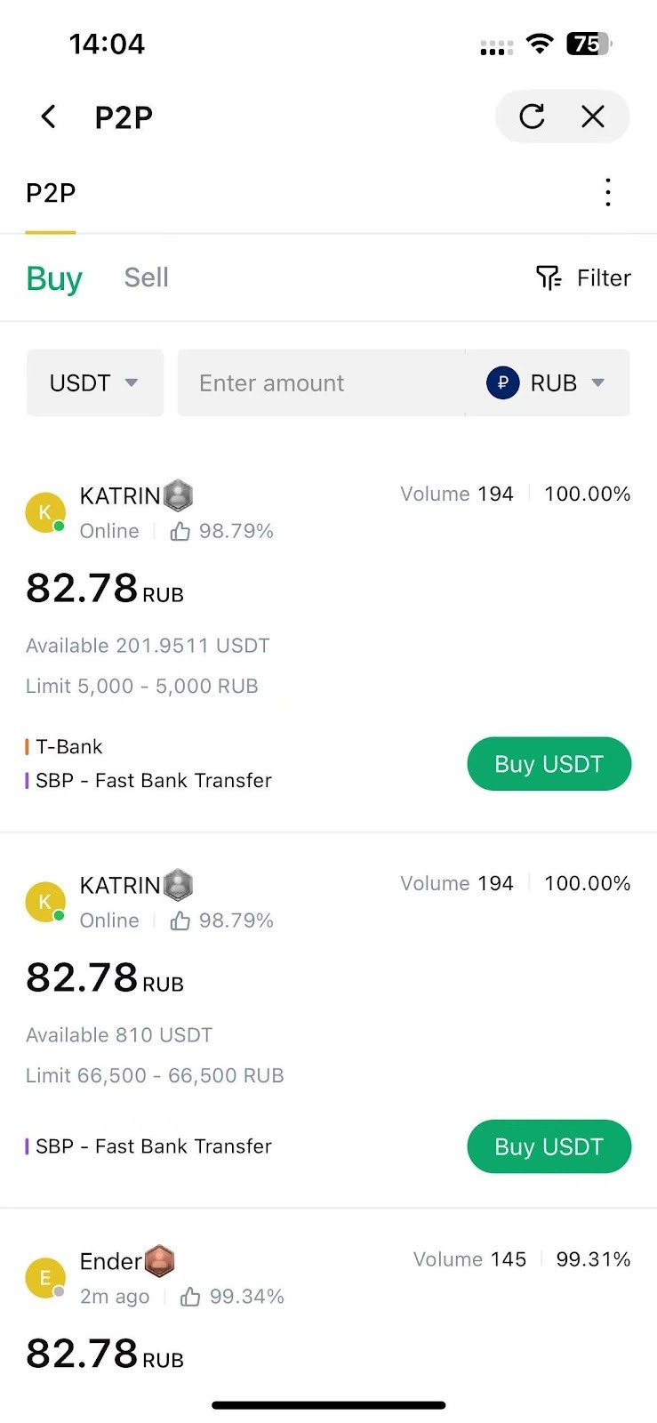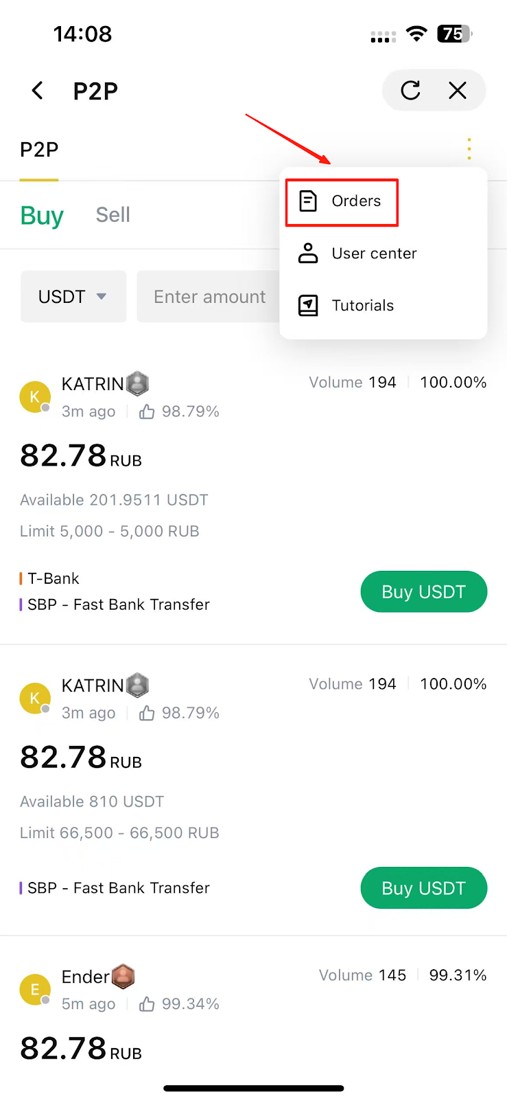- Appuyez sur l'icône à trois points dans le coin supérieur droit de la page de trading P2P.