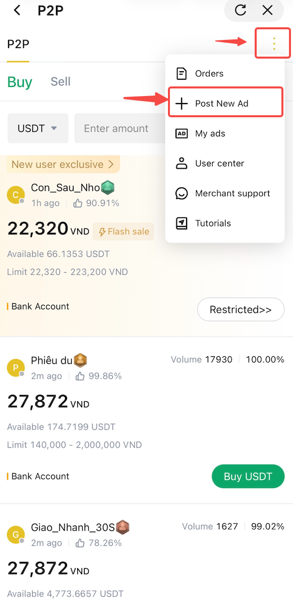- Nella pagina P2P, tocca il pulsante menu (tre puntini) nell'angolo in alto a destra, quindi seleziona "Pubblica nuovo annuncio".