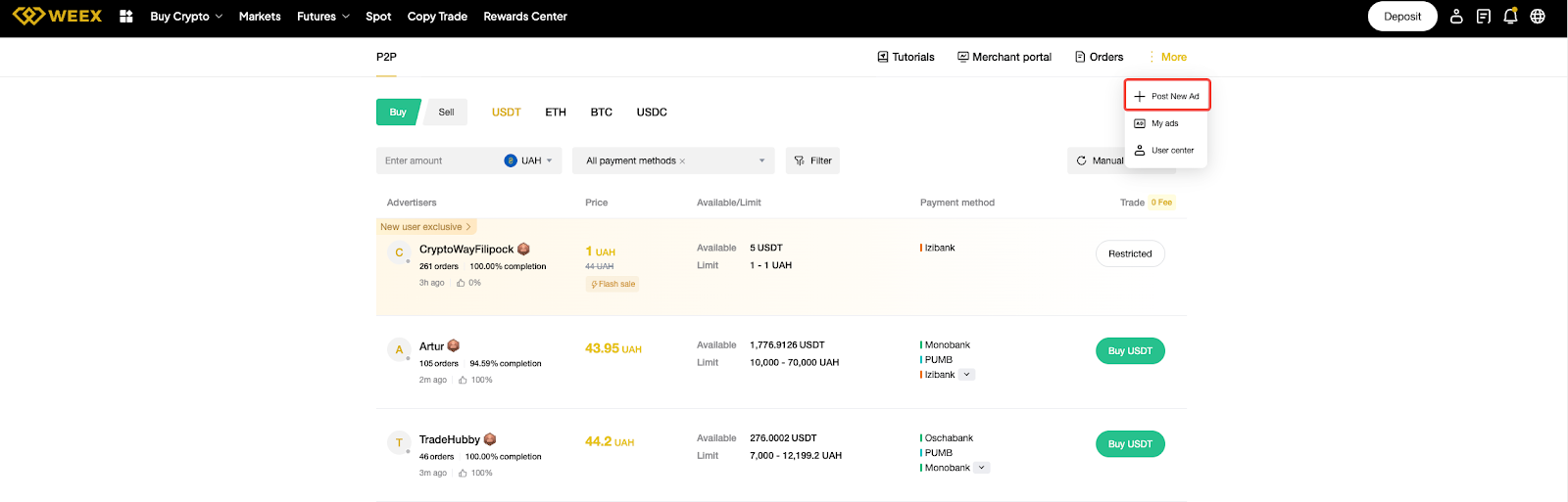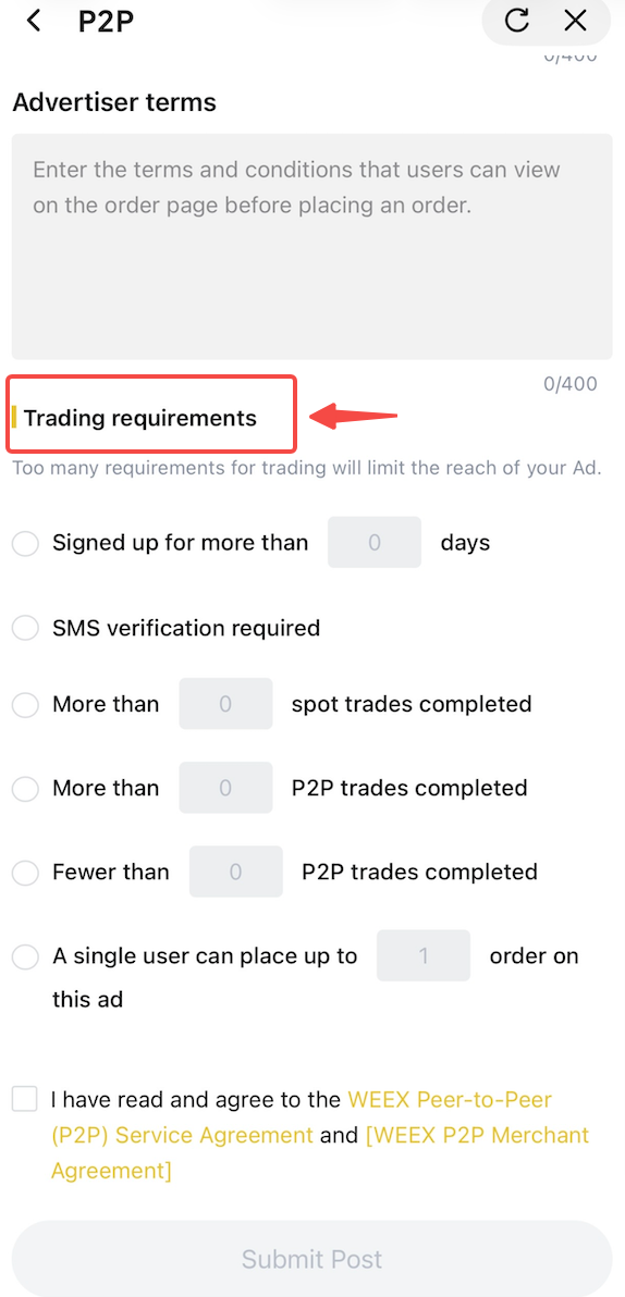 Attualmente, solo i commercianti P2P verificati possono pubblicare annunci. Fai domanda per diventare un commerciante P2P WEEX.