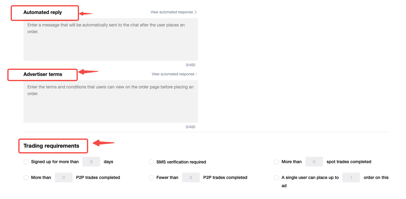- Requisiti di trading (opzionale): imposta le condizioni per filtrare le controparti, ad esempio limitando l'ordine a coloro che hanno completato la verifica telefonica.