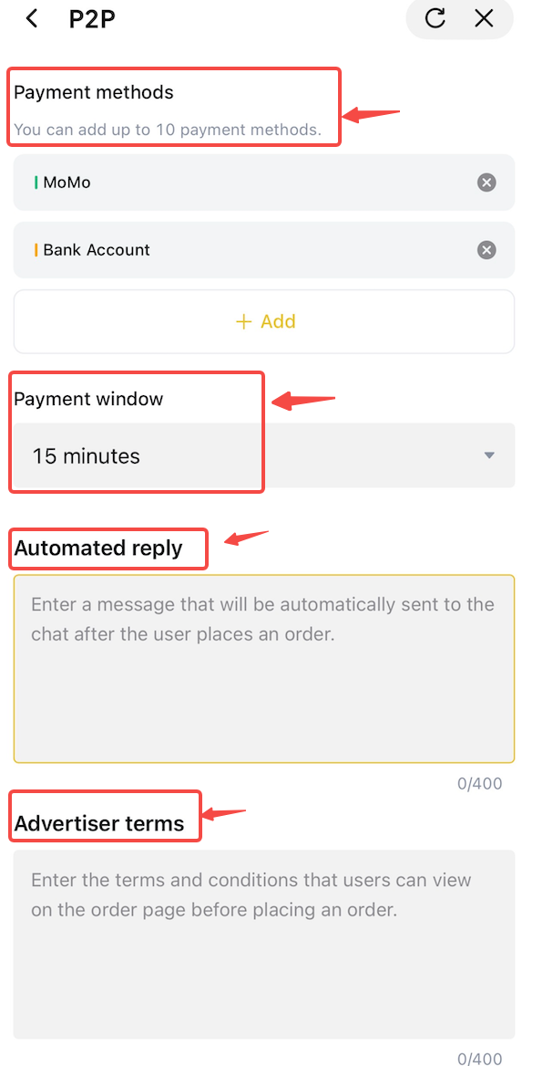 - Imposta finestra di pagamento: specifica la finestra di pagamento per l'acquirente per completare il trasferimento (ad esempio: 15, 20 o 30 minuti). L'ordine verrà automaticamente annullato se il pagamento non viene completato entro il periodo di tempo stabilito.