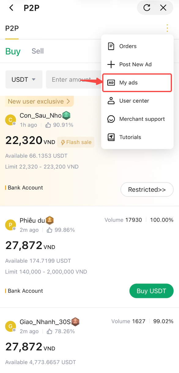 Nella pagina P2P, tocca il pulsante del menu (tre puntini) nell'angolo in alto a destra e seleziona "I miei annunci". Puoi visualizzare lo stato dei tuoi annunci e modificarli, eliminarli o condividerli in qualsiasi momento.