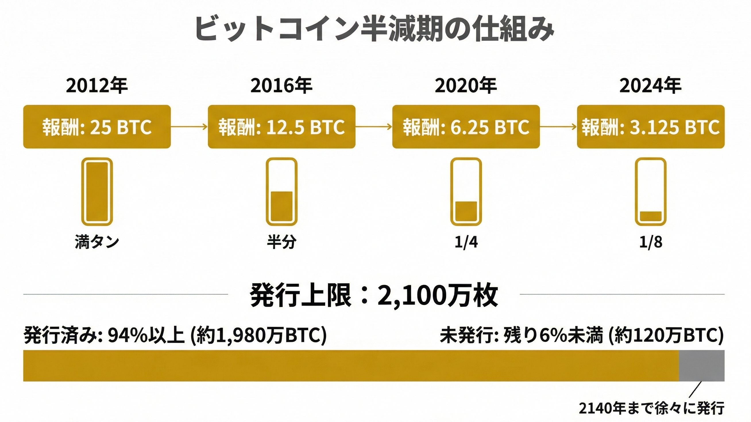 本記事では、ビットコイン半減期の基本的な仕組みから、過去のデータ、そして次回2028年の半減期に向けた投資戦略まで、初心者の方にもわかりやすく徹底解説します。