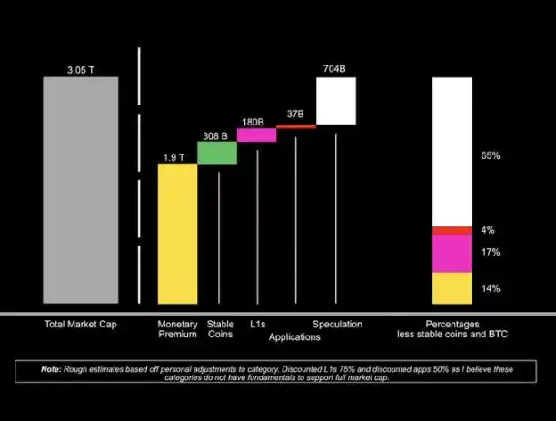 Fundamentals determine the price floor. For most tokens, this floor is far below the current price. Even at the current valuation levels, the market cap of the vast majority of tokens is still primarily driven by speculative premium—a value attributed by people expecting to sell at a high price in the future. This premium is highly correlated with overall market volatility and naturally decays over time. The more mature the sector, the smaller the speculation space.