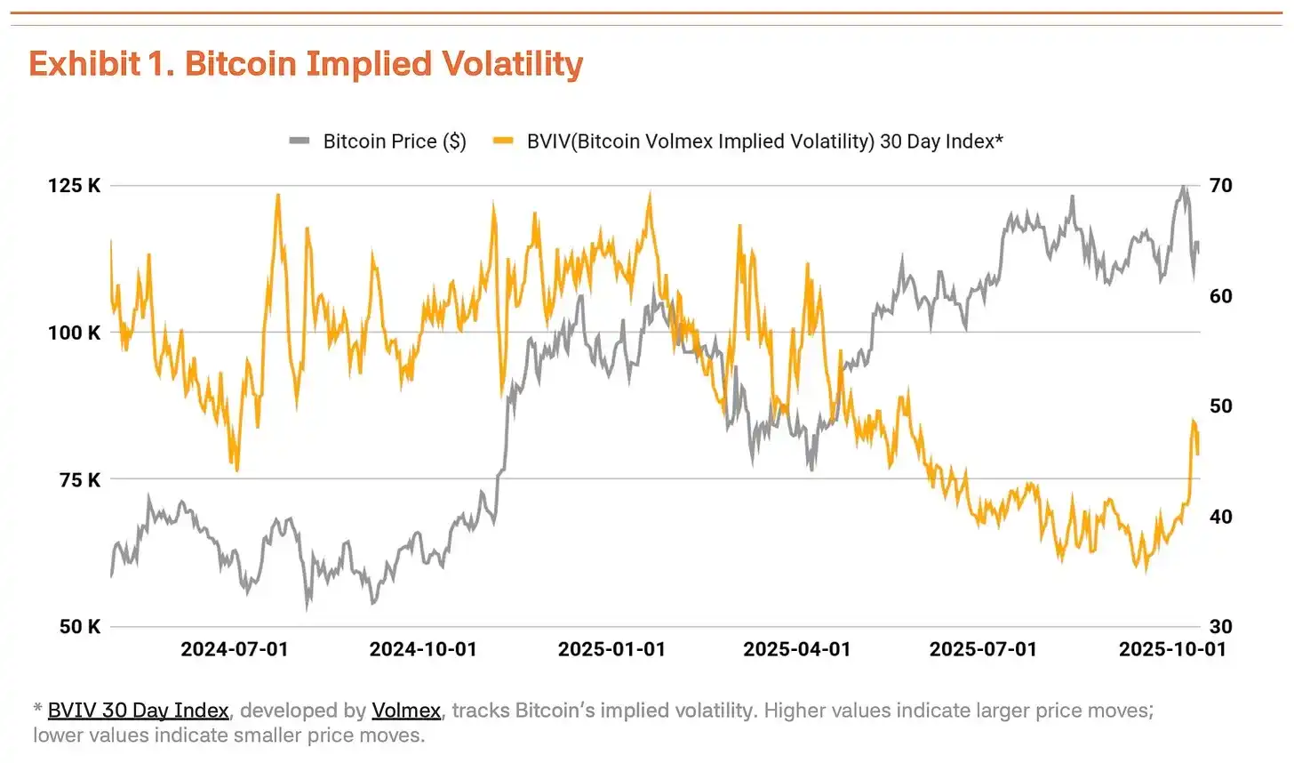 On October 6, Bitcoin hit a new all-time high of $126,210. However, the Trump administration once again applied trade pressure on China, leading to a price correction of 18% to $104,000, significantly increasing volatility. According to Volmex Finance's Bitcoin Volatility Index (BVIV), institutional investors continued to accumulate steadily, with Bitcoin's volatility narrowing from March to September but surging by 41% after September, intensifying market uncertainty (Chart 1).