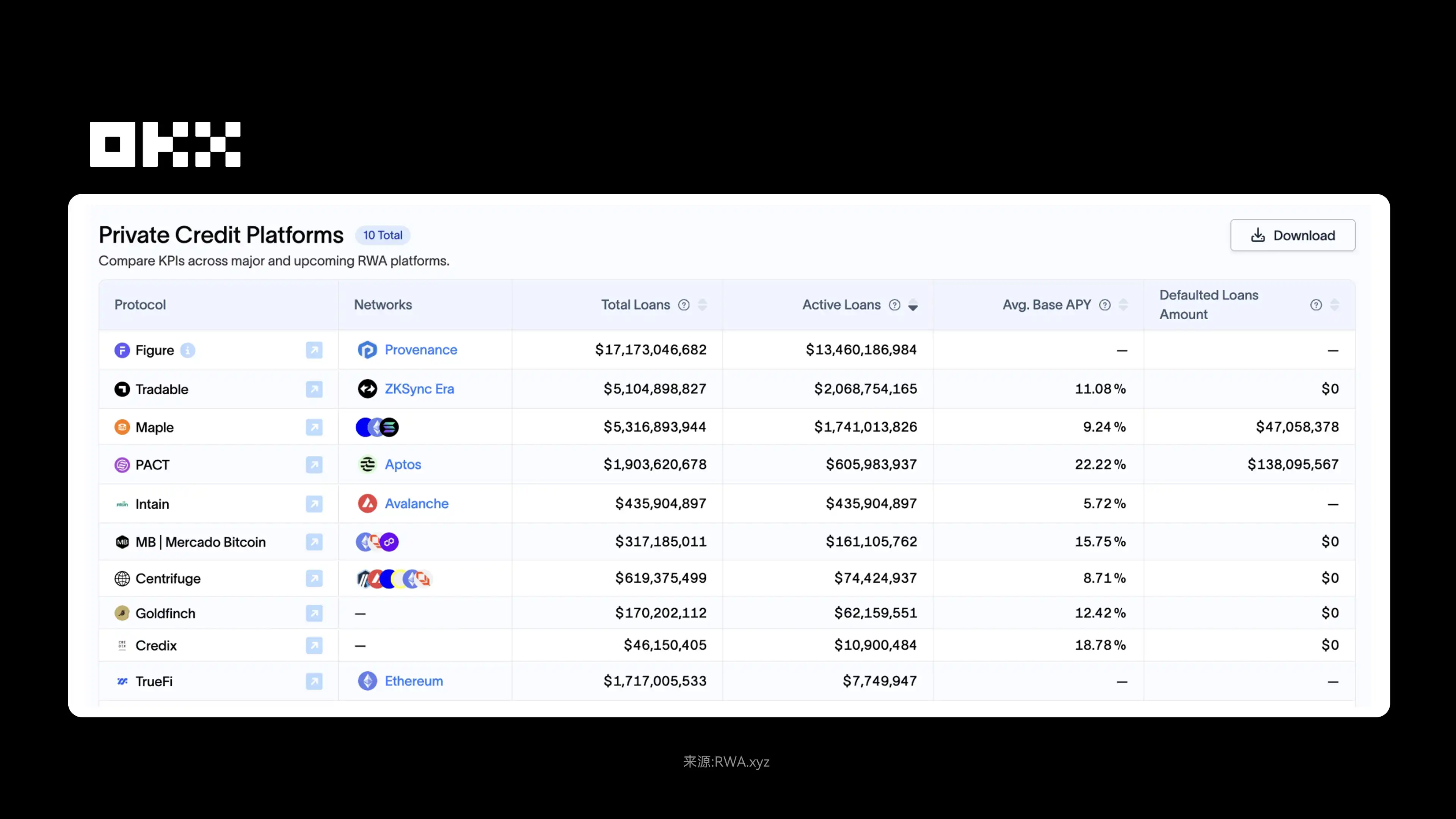 As of November 7, 2025, the active loan size of private credit in the RWA space is approximately $18.66 billion, with an average annualized interest rate of 9.79% and a total of 2,710 loans. The Figure platform occupies about 92% of the market share, with a total loan amount of $17.2 billion; Centrifuge, through a multi-chain architecture interoperable with DeFi protocols, has seen its TVL increase from $350 million to over $1.3 billion, with a historical annualized yield of 8%-15%.