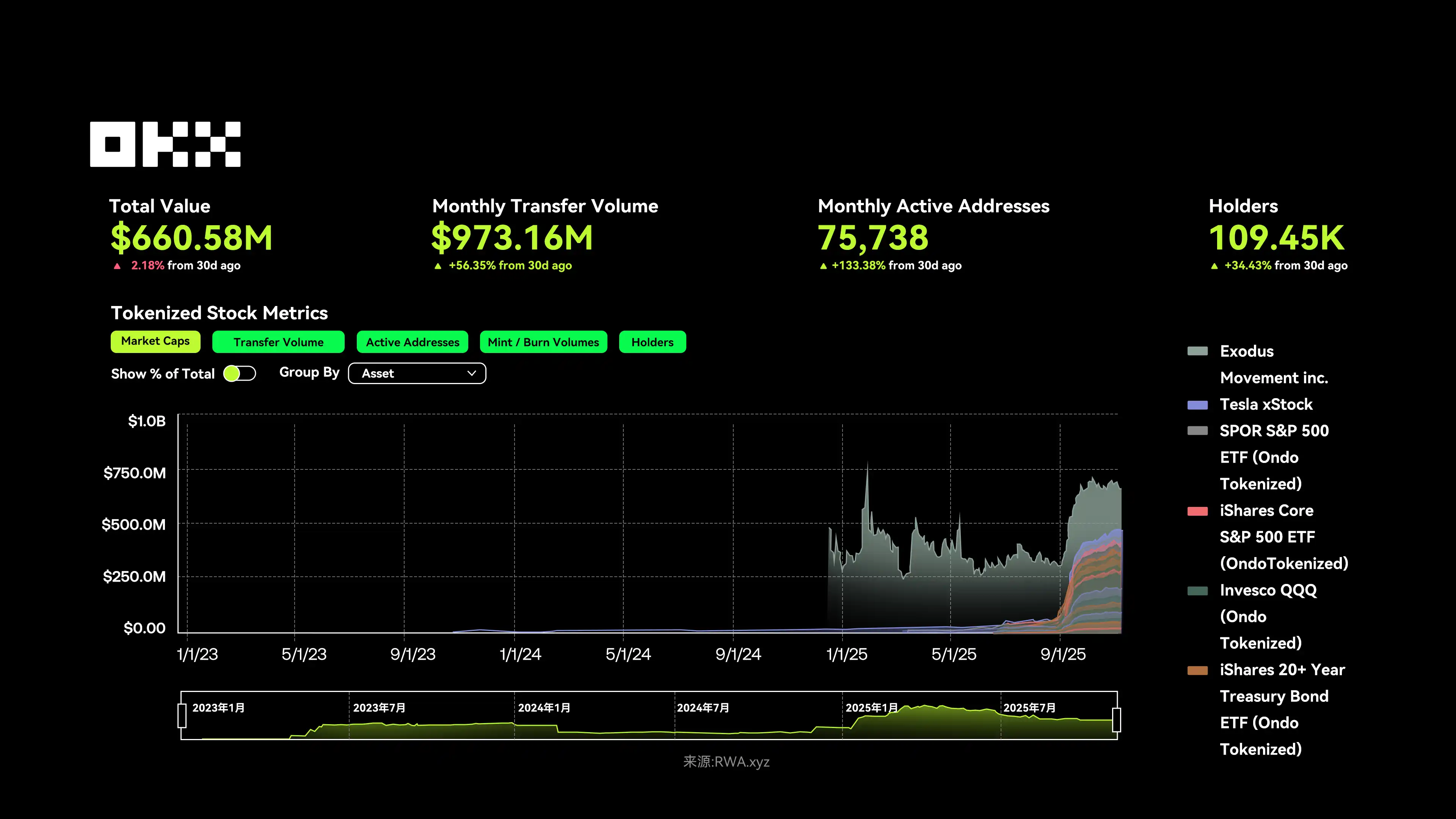 As of November 10, 2025, the total locked value of listed stocks was approximately $661 million, with a monthly trading volume of $973 million (a MoM increase of +56.35%), 75,738 active addresses (a MoM increase of +133.38%), and a total holder count exceeding 109,000 (a MoM increase of +34.43%). Overall, user participation and trading activity are continuously rebounding, indicating that the market is entering a new growth cycle.