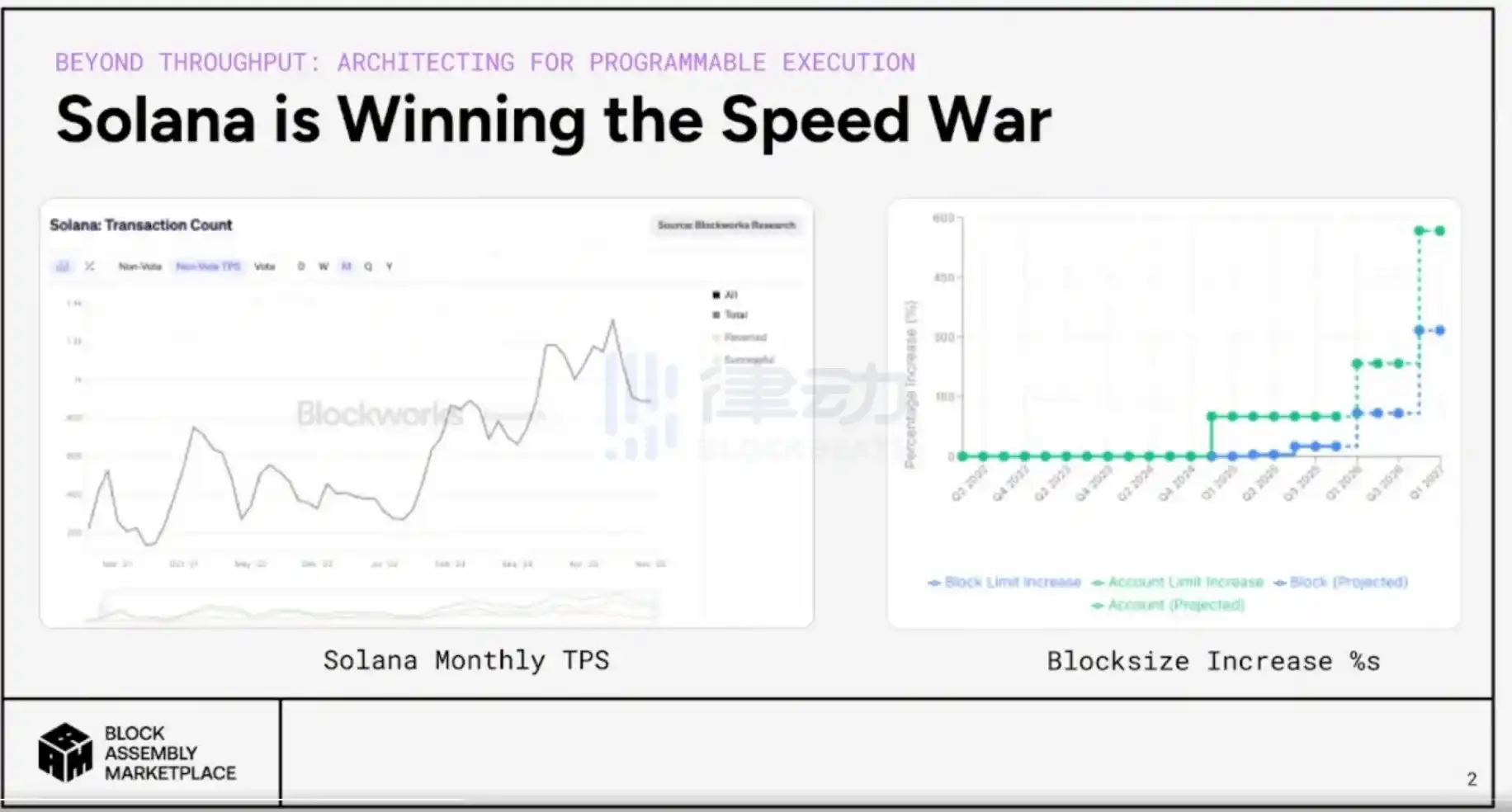 In the chart on the right, you can see the continuous growth of block space over the past few years. Earlier this year, Solana's block compute limit was about 48 million compute units, which then increased to 50 million and 60 million compute units. It is expected to surge to 100 million compute units early next year and continue to experience exponential growth."