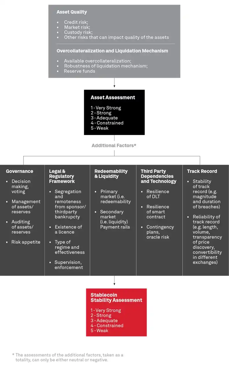 · After completing the asset quality assessment, S&P will also consider governance mechanisms, legal and regulatory frameworks, redemption capabilities and liquidity, technology and third-party dependencies, historical records, and five additional dimensions (dark gray box in the diagram below);