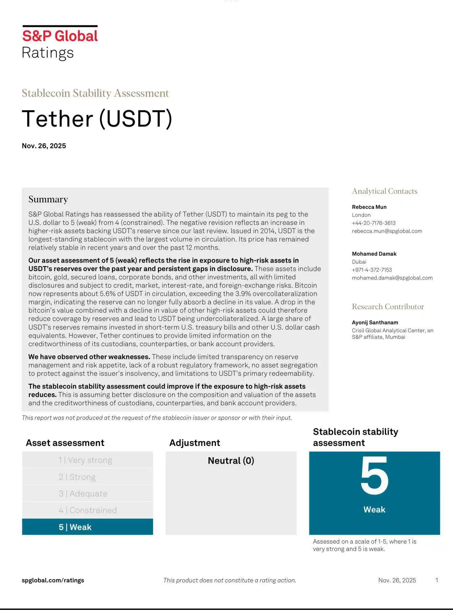 On November 26th, U.S. Eastern Time, top rating agency S&P Global announced that it had downgraded the rating of stablecoin giant Tether (USDT) from "4" (Restricted) to "5" (Vulnerable), the lowest level in its rating system.