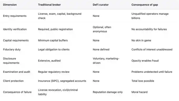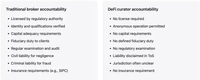 Comparing DeFi risk orchestrators to traditional brokers is enlightening as it reveals the lack of accountability mechanisms in the orchestrator model. This is not to argue that traditional finance is the ideal model or that its regulatory structure should be directly replicated.