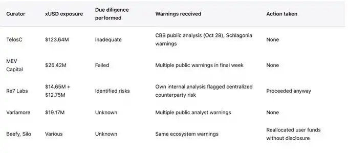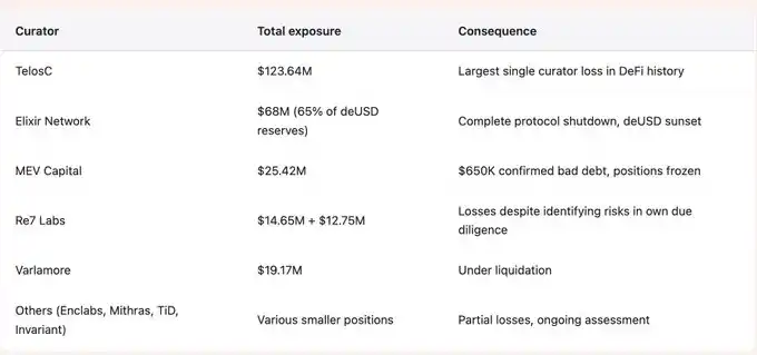 This contagion spread throughout the entire ecosystem, resulting in a $285 million loss. Risk Curators such as TelosC ($123.64 million), Elixir ($68 million), MEV Capital ($25.42 million), Re7 Labs (two vaults totaling $27.4 million), concentrated user deposits with a single counterparty who, with only $1.9 million in real collateral, used 7.6x leverage.