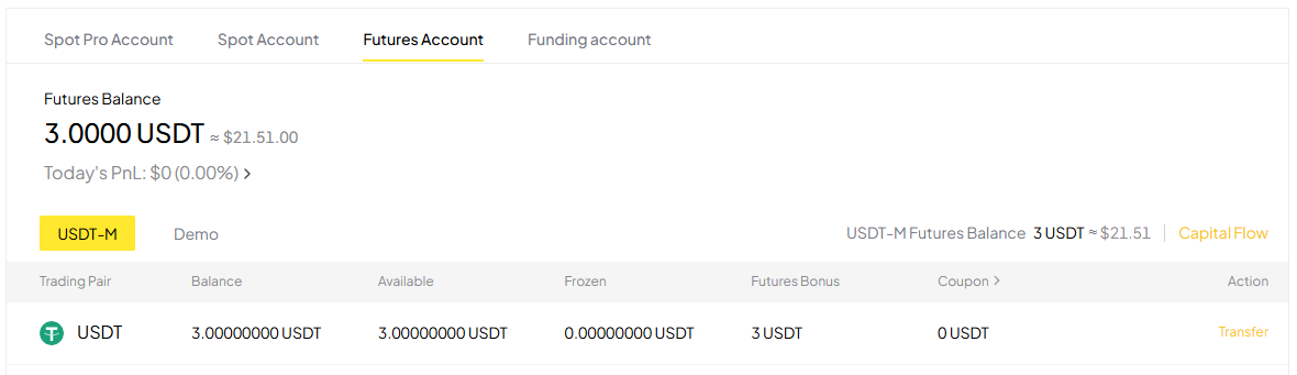 Cheque seu histórico de pedidos e registros de ativos após abrir ou fechar posições. Seu capital permanece inalterado porque o bônus de futuros foi usado para cobrir a perda e pagar as taxas de transação.