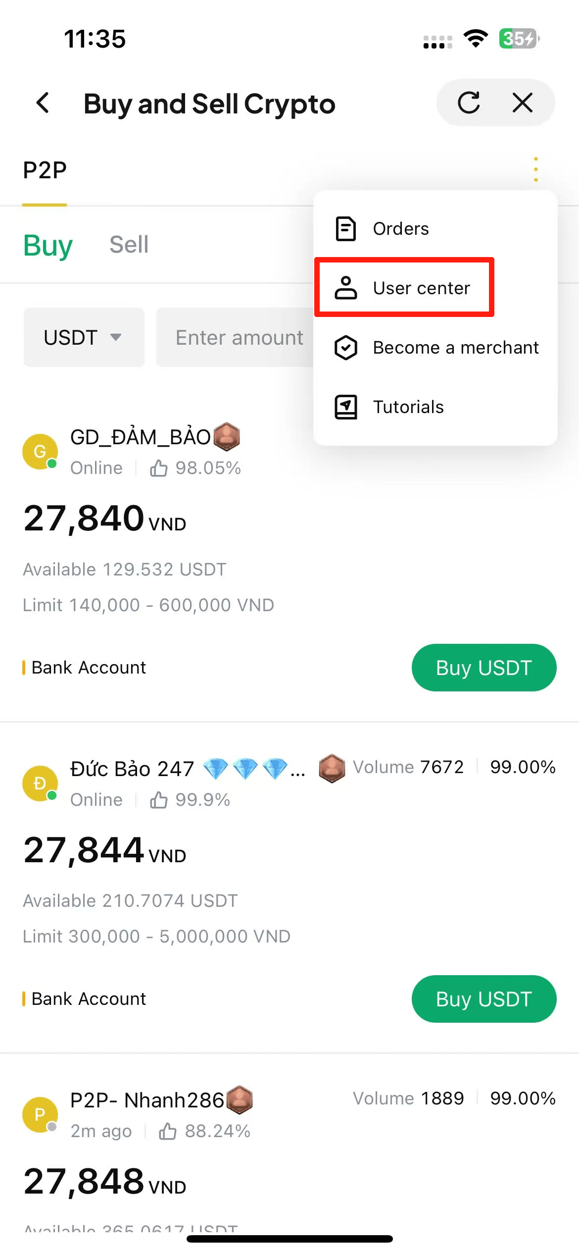 - Navegue para a página de gerenciamento P2P: Toque no ícone de três pontos no canto superior direito e selecione "Centro de usuário".