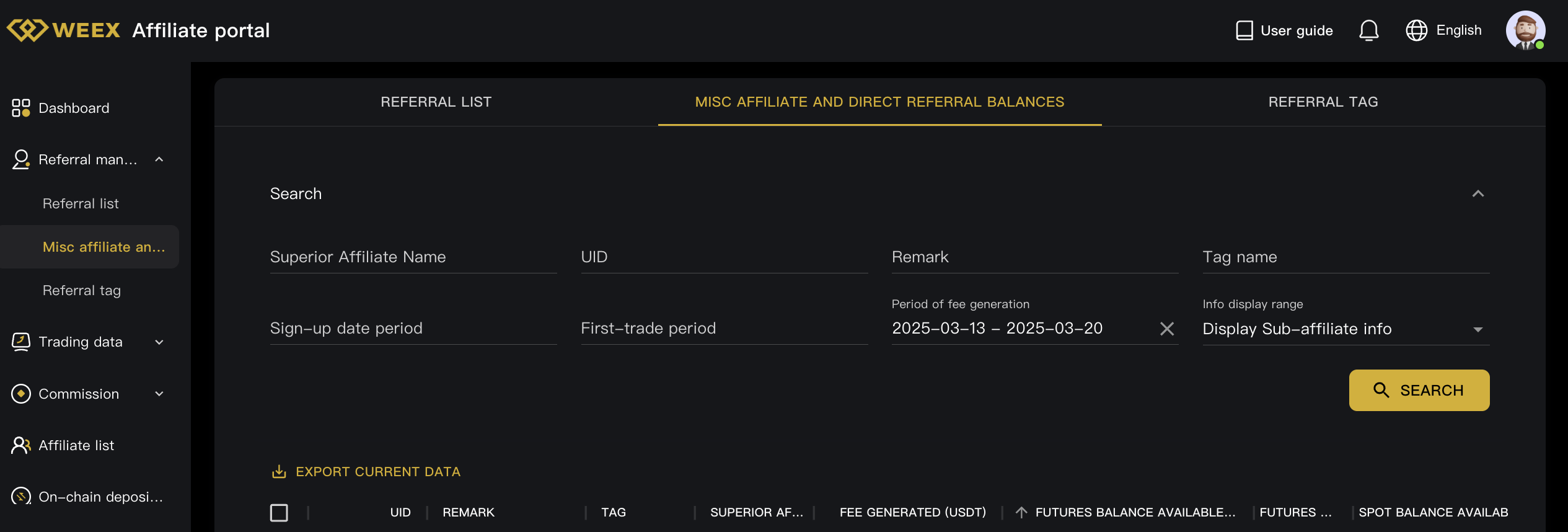 Clique no botão “Saldos de afiliados diversos e referências diretas” e você será direcionado para a página onde poderá pesquisar e verificar o UID, observação, tag, função de referência, nome do afiliado superior, taxa gerada, saldo futuro e saldo à vista dos seus parceiros convidados .