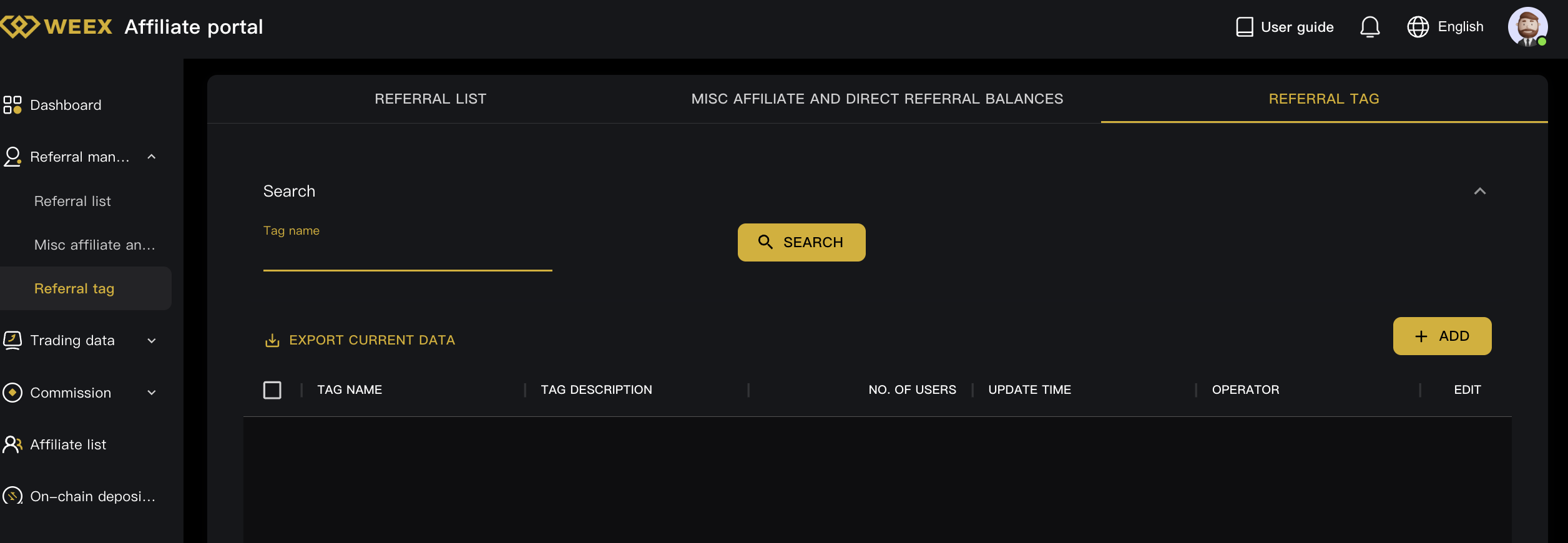 Clique no botão Lista de referências e você será direcionado para a página onde poderá pesquisar as informações de tag do seu parceiro, incluindo Nome da tag, Descrição da tag, Volume do usuário, Hora da atualização e Operador.