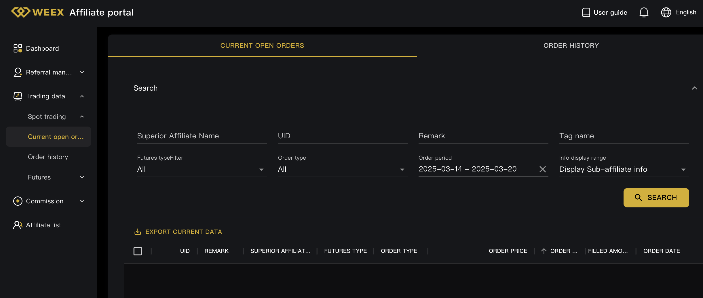 Na seção de pedidos atuais, você pode pesquisar e verificar as informações sobre UID, Observação, Nome do Afiliado Superior, Tipo Futuro, Tipo de Pedido, Preço do Pedido, Valor do Pedido, Valor Preenchido e Data do Pedido.
