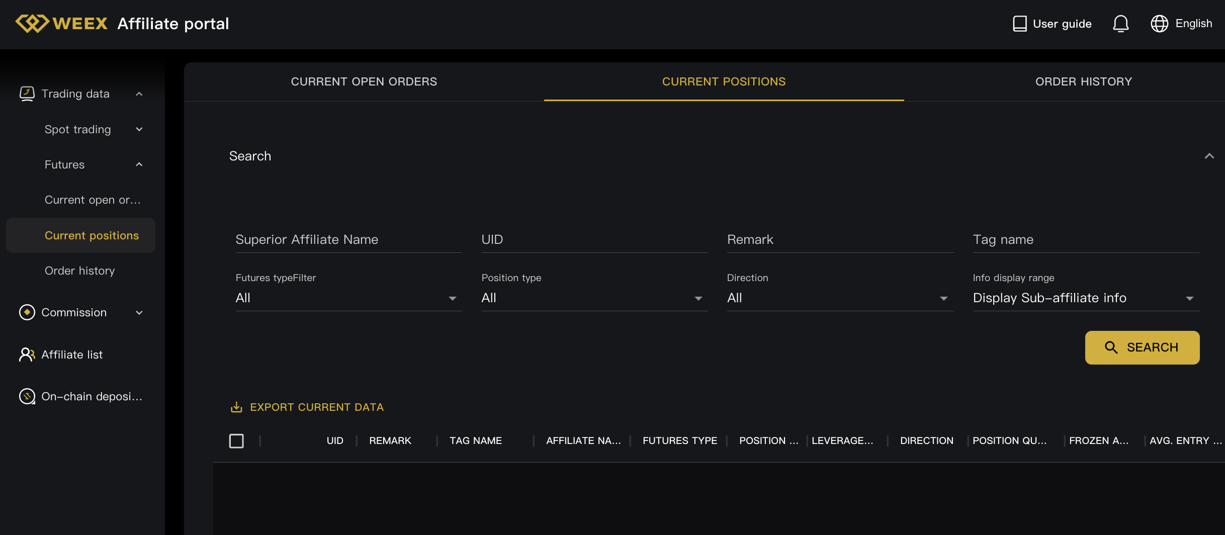 Clique no botão “Posições atuais específicas de futuros” e você será direcionado para a página onde poderá pesquisar e verificar o UID, observação, nome da tag, nome do afiliado, tipo de futuro, tipo de posição, alavancagem, direção, quantidade da posição, valor congelado, preço médio de entrada, margem utilizada, taxa de margem, preço de liquidação estimado, preço de risco e PNL não realizado da posição atual dos afiliados.