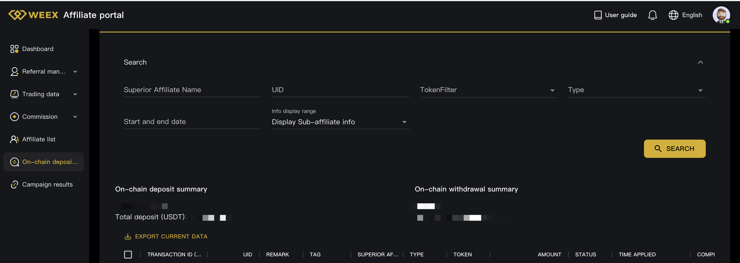 O botão Depósito na cadeia está abaixo do botão Lista de afiliados e você verá a página que pode ser usada para pesquisar as informações de depósito dos afiliados, incluindo ID da transação, UID, observação, tag, nome superior, tipo, token, valor, status, hora da solicitação e hora de conclusão.