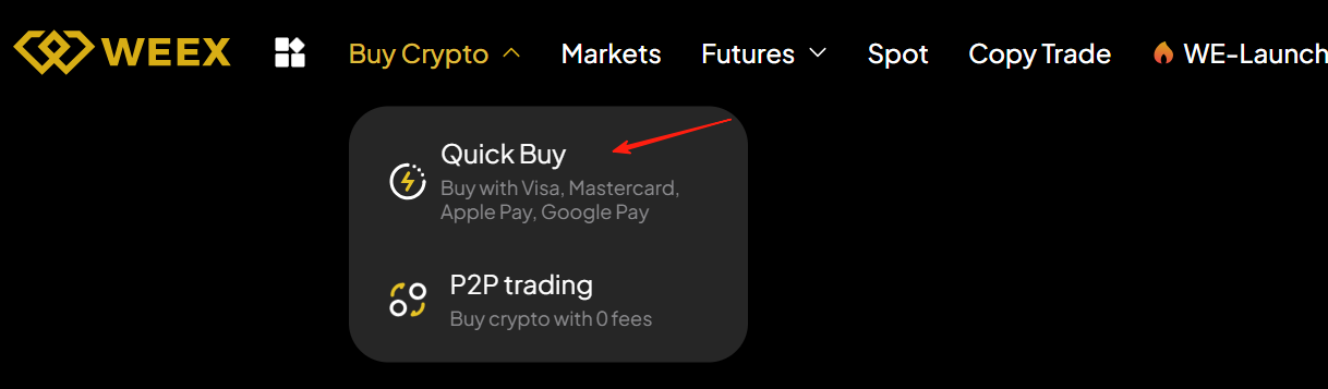 Крок 1: Виберіть «Купити криптовалюту» на панелі навігації, а потім натисніть «Швидка покупка», щоб розпочати.