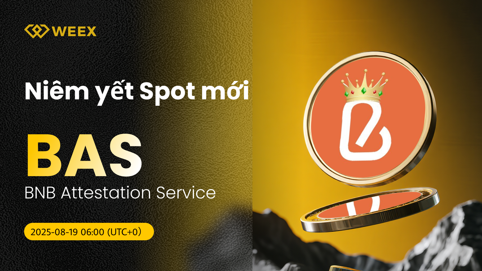 Chúng tôi vui mừng thông báo rằng Dịch vụ Chứng thực BNB (BAS) hiện đã chính thức có sẵn trên giao dịch spot của WEEX! Từ bây giờ, bạn có thể giao dịch BAS/USDT một cách dễ dàng trên nền tảng WEEX. Chi tiết như sau: