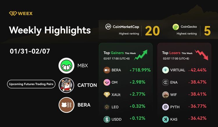 WEEX ranks #20 on CoinMarketCap, introduces new trading pairs (MBX, CATTON, BERA), launches airdrop rewards, and highlights market trends. BERA surges 718.99%, while WXT jumps 101%. Join WEEX for top-tier trading!