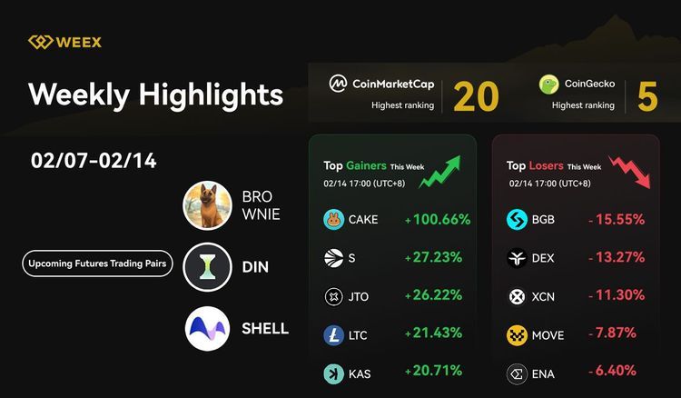 WEEX ranks #20 on CoinMarketCap and #5 on CoinGecko, introduces new contract pairs (BROWNIE, DIN, SHELL), launches a $1M WXT airdrop and Lucky Spin, and highlights market trends, with CAKE surging 100%. Secure trading with 1000 BTC protection fund.