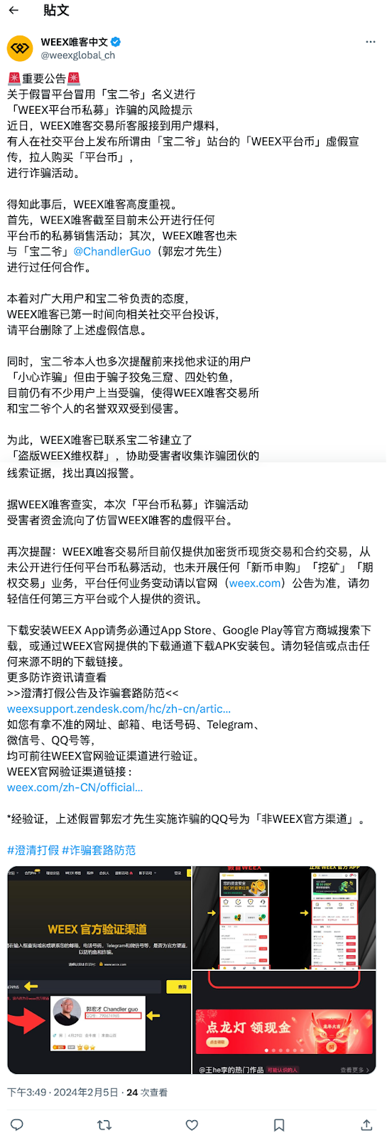 2024 年 2 月 5 日,WEEX唯客交易所官网(weex.com)发布了《关于假冒平台冒用「宝二爷」名义进行「WEEX平台币私募」诈骗的风险提示》,曝光有诈骗团伙冒用 WEEX 名义,搭建假冒平台 app.weex-btc.com,同时假冒宝二爷(郭宏才先生)的名义进行所谓的「平台币私募」销售诈骗,用户资金有进无出,提醒广大网友注意甄别,防止上当受骗。
