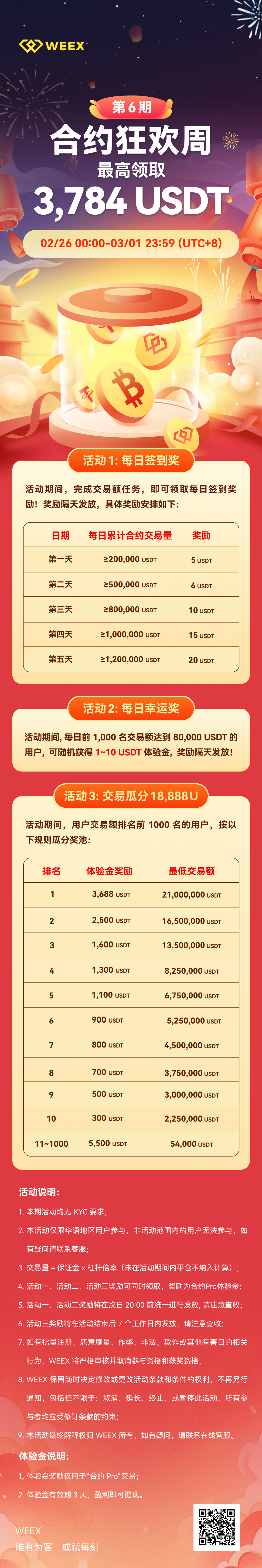 WEEX合约狂欢周第6期,最高领取3,784 USDT!【已结束】