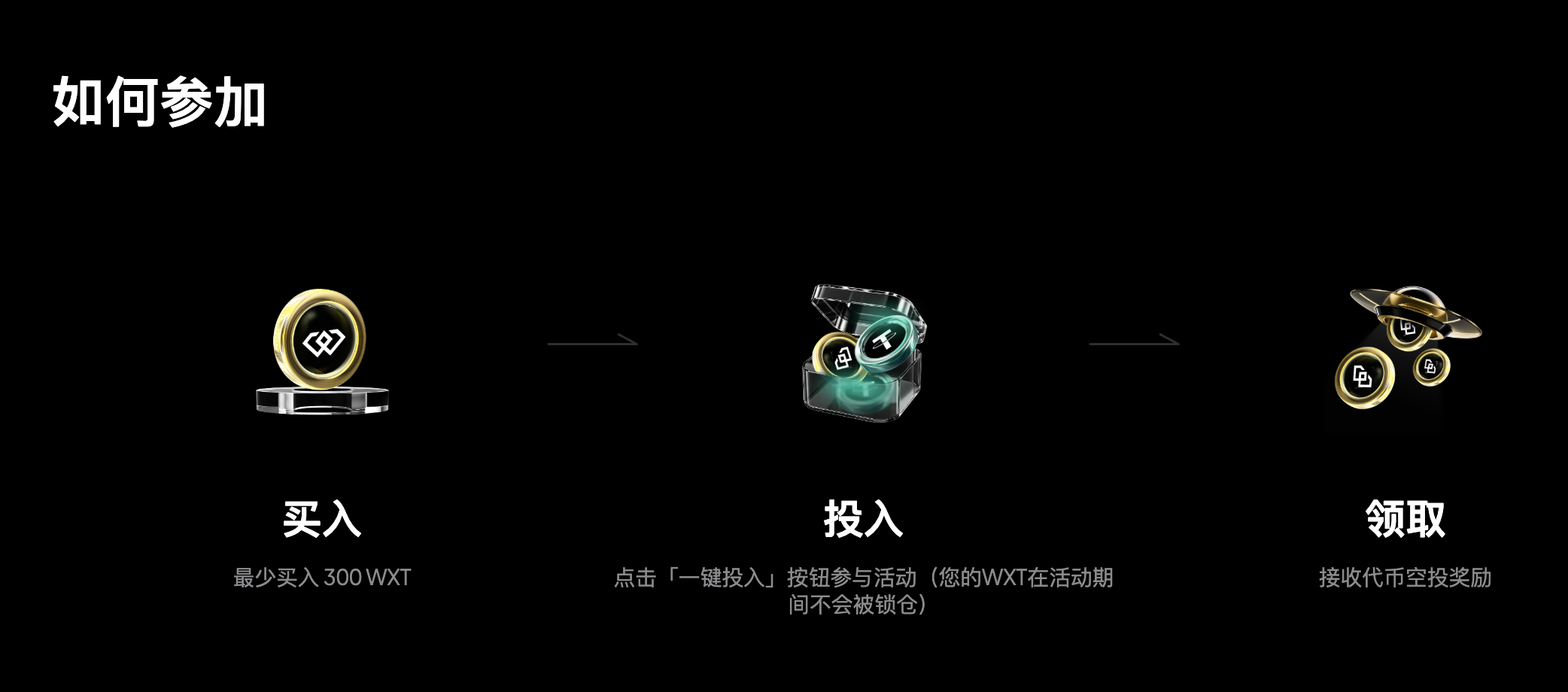 - 符合活动参与资格后,可在投入时间段内进行投入;投入成功后仅用于奖励核算,不会冻结WXT或者对应token的钱包里持仓;