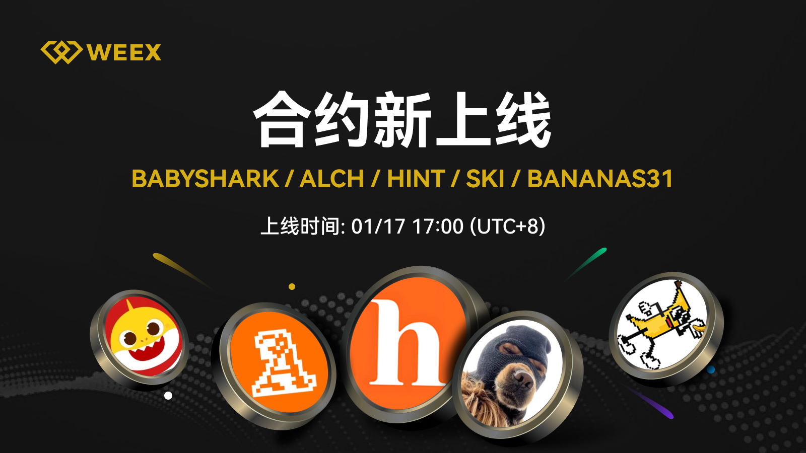 WEEX合约将于2025年1月17日17:00 [UTC+8]上线BABYSHARK、ALCH、HINT、SKI、BANANAS31 U本位合约。
