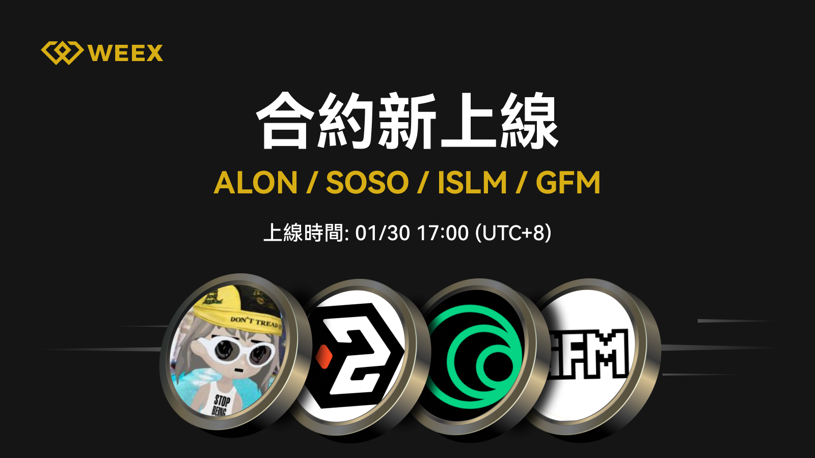WEEX合約將於2025年1月30日17:00 [UTC+8]上線ALON、SOSO、ISLM、GFM U本本位合約。