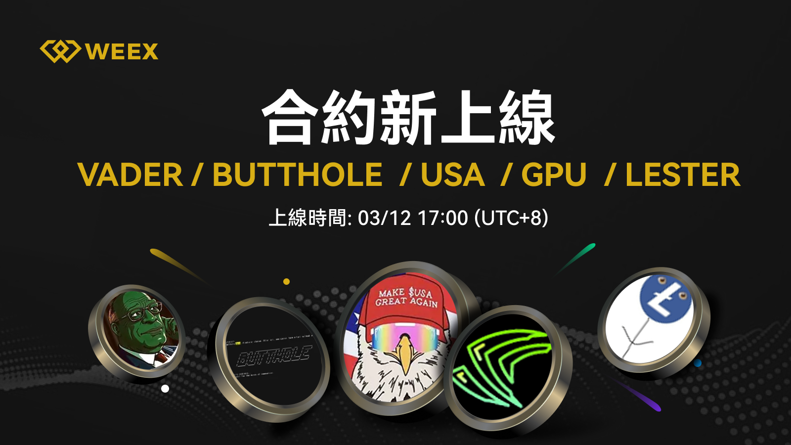 WEEX合約將上線VADER、BUTTHOLE、USA、GPU、LESTER U本位合約 - 3/12 17:00 UTC+8