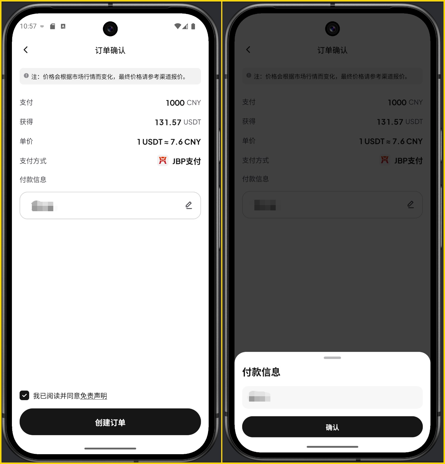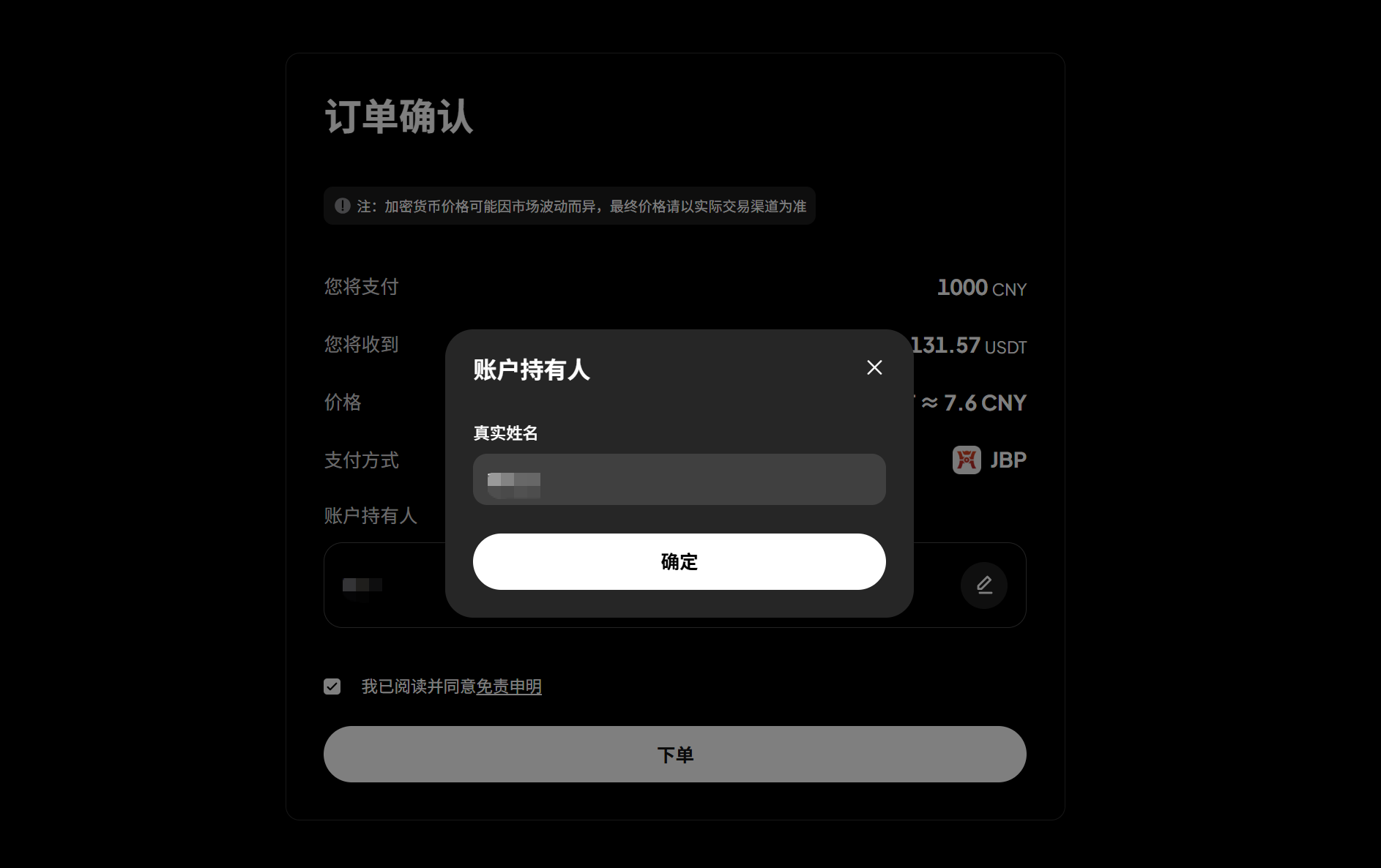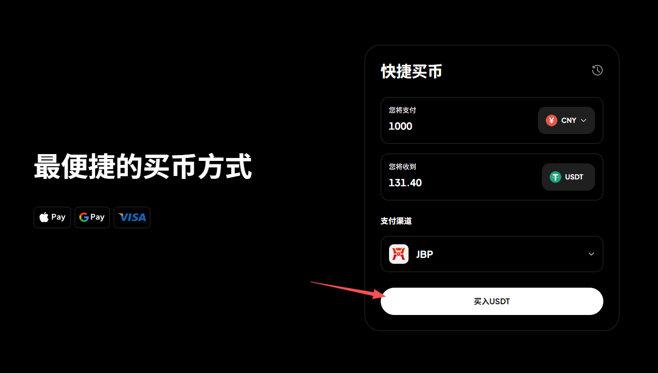 第三步:快捷買幣-選擇CNY法幣以及USDT加密貨幣,付款方式選擇JBP支付,點擊完成