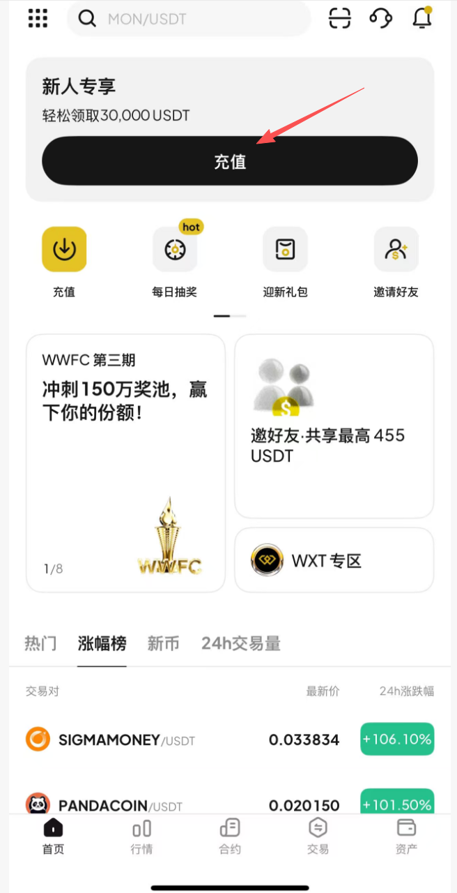第一步:進入APP首頁-點擊充值或進入資產頁面-點擊買幣