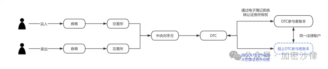 目前,美股的托管記賬採用這樣的運行模式:假設證券商在 DTC 有帳戶,DTC 會用一套中心化系統記錄買入、賣出的每一筆股票和份額。而這次 DTC 提出,我們能不能給證券商提供一個選擇,把這些股票持有記錄用區塊鏈代幣的方式再記錄一遍?
